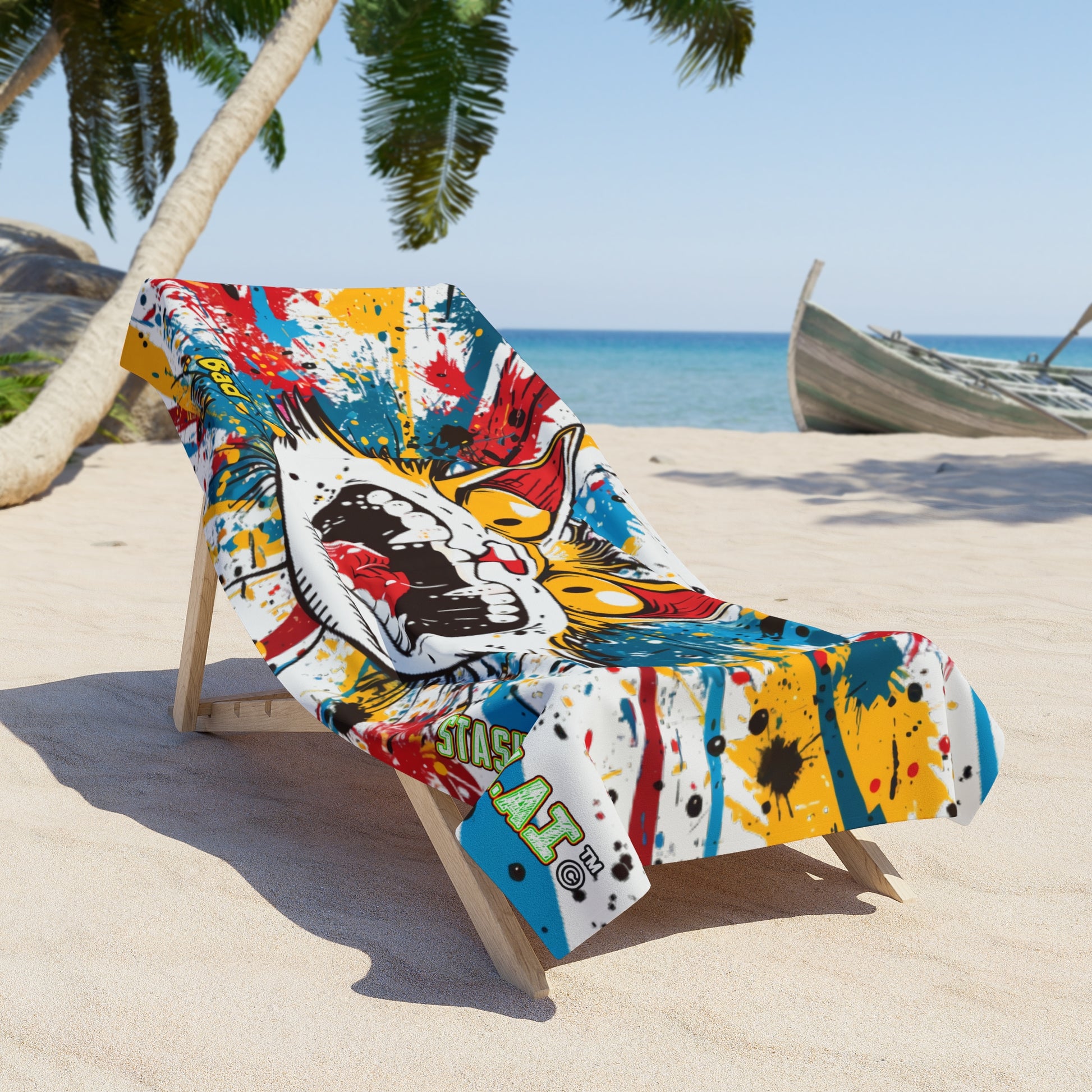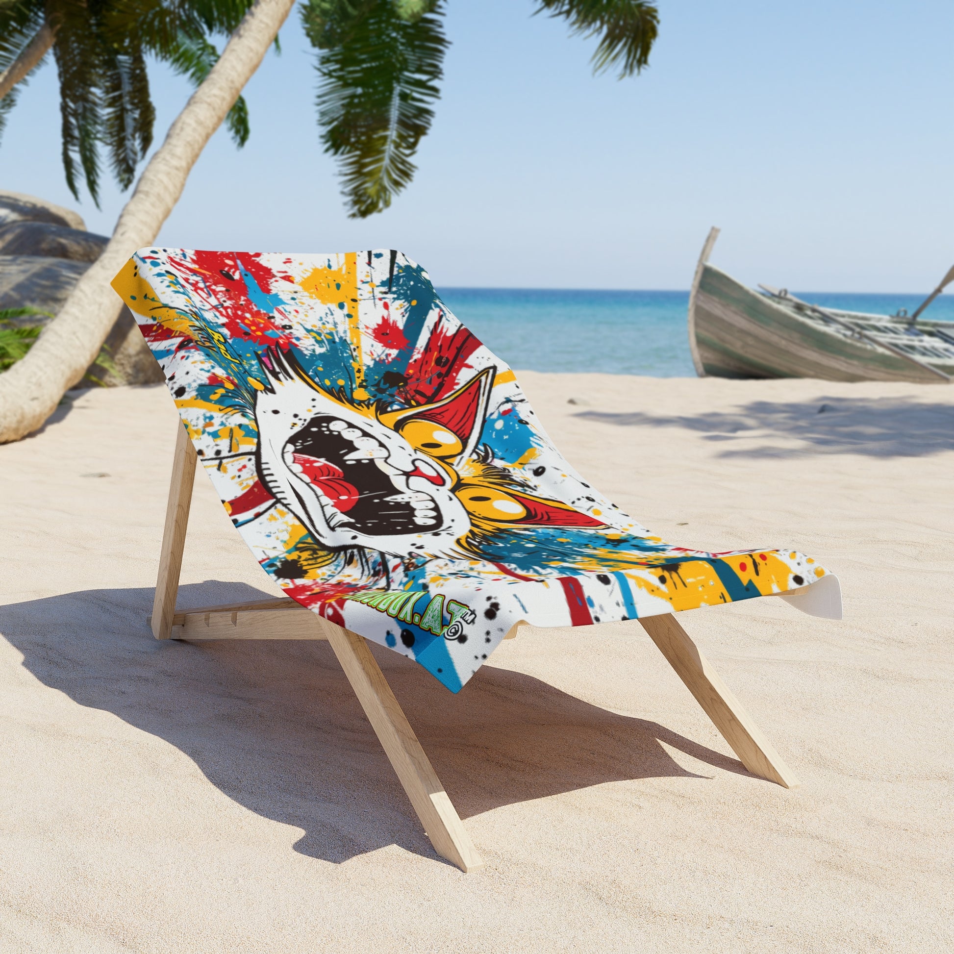 The central graphic showcases a fierce cat with a mouth wide open, painted with bold red and yellow splashes on a sleek black background. Surrounding the cat, colorful vector graphics and graffiti-style splashes add an extra layer of excitement, reminiscent of iconic comic art. The bright colors and intricate details make this towel a true statement piece, combining functionality with artistic flair. 🌈🖤🖌️