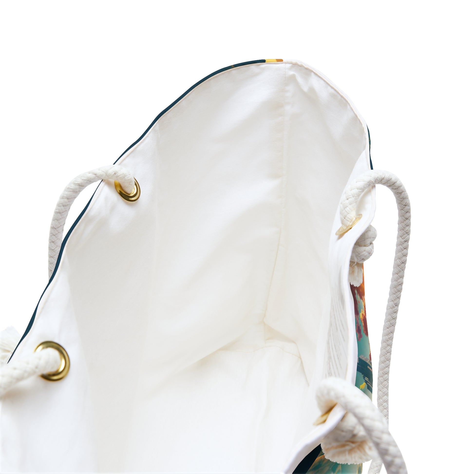 The bag showcases dreamlike surrealist landscapes, reminiscent of national geographic photos, with forestpunk aesthetics and highly detailed environments. The cityscape, rendered in light cyan and amber, evokes a sense of wonder and artistic brilliance.