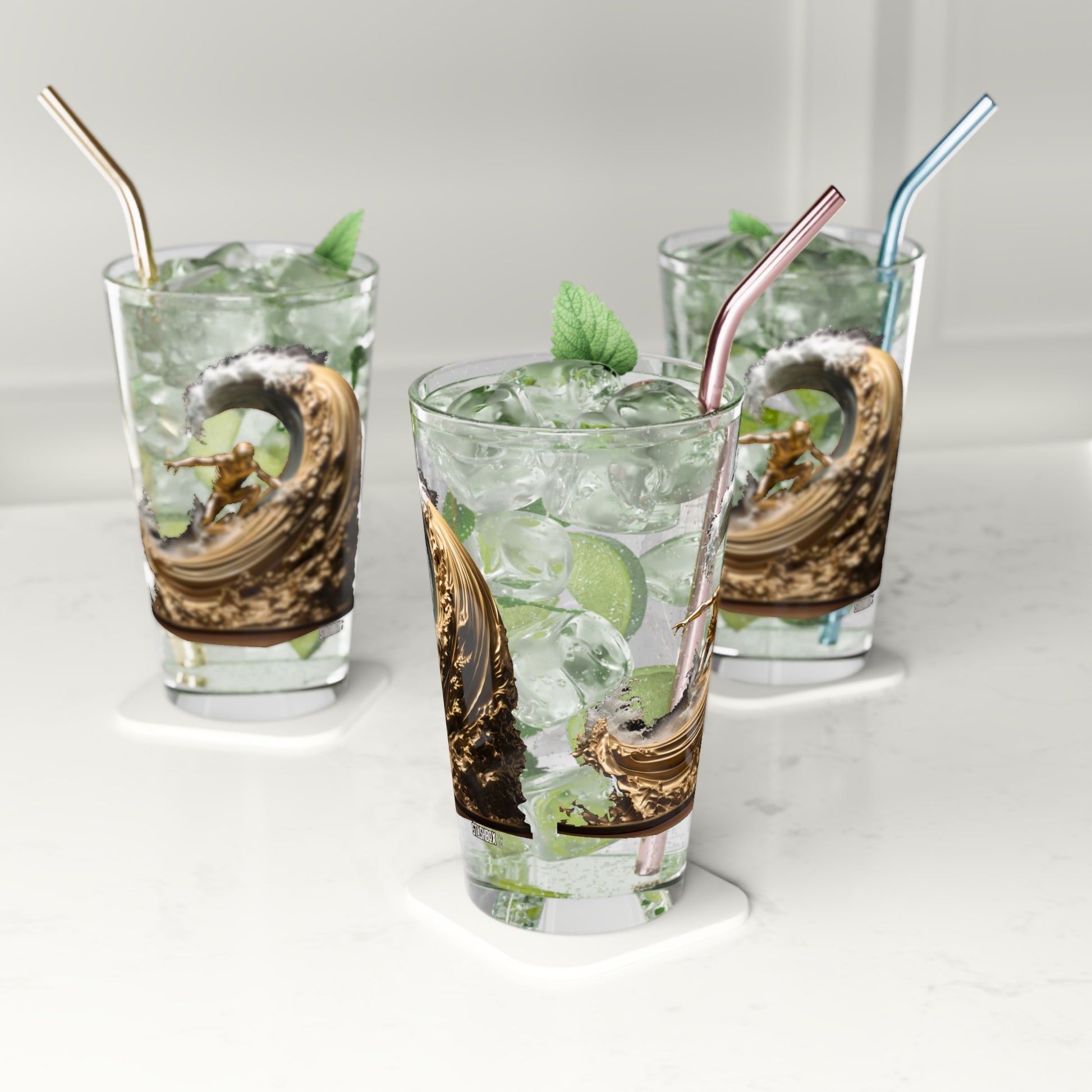 Introducing our Golden Wave Statue Pint Glass, 16oz - a fusion of artistic brilliance and golden elegance. This pint glass isn't just a vessel; it's a work of art, a celebration of craftsmanship, and a testament to the captivating allure of gold. Crafted with precision and designed for both style and sophistication, this pint glass is your ticket to a world of golden grandeur.