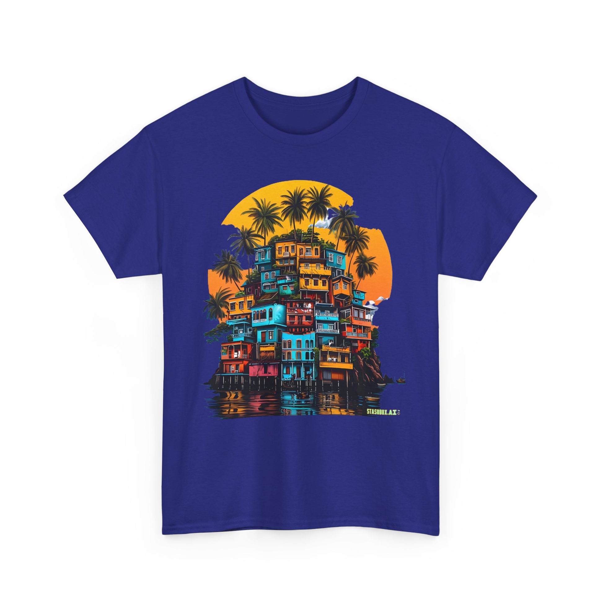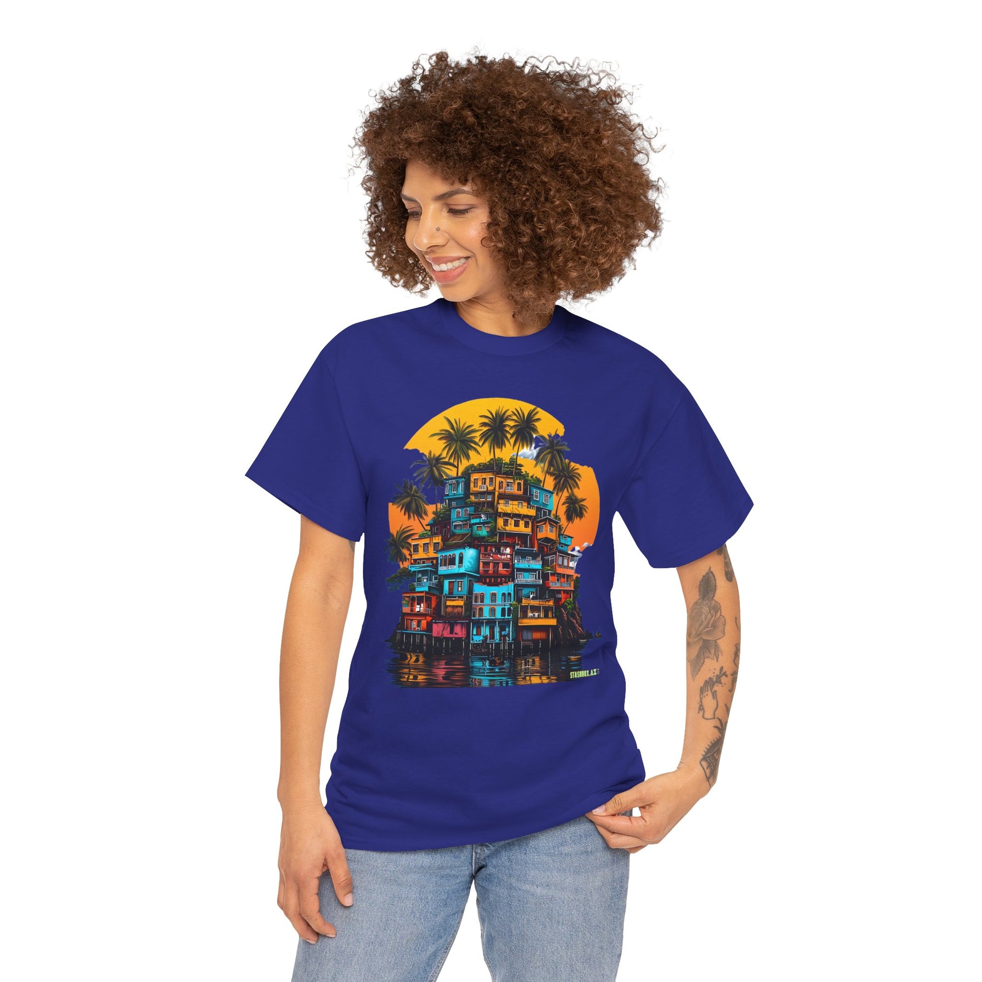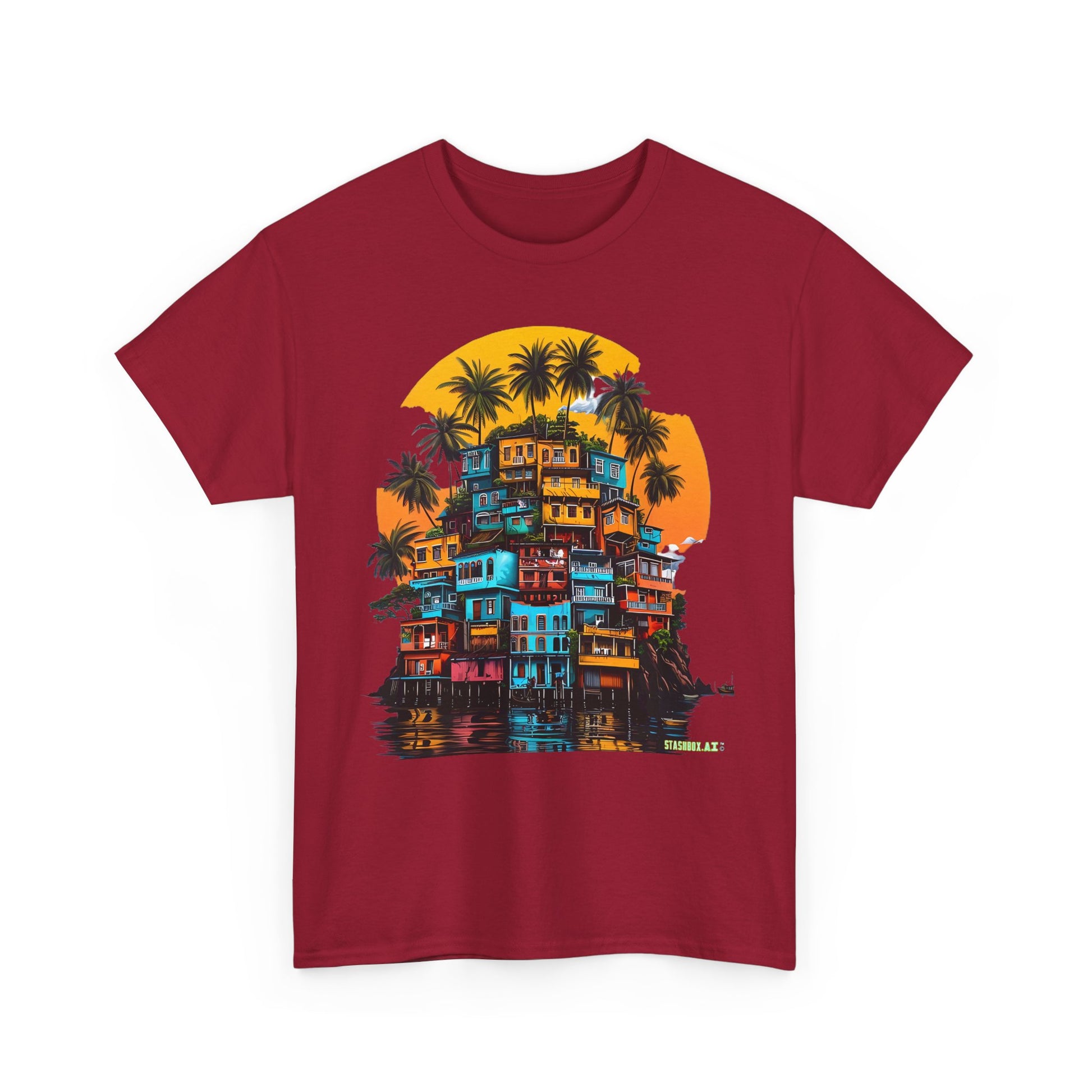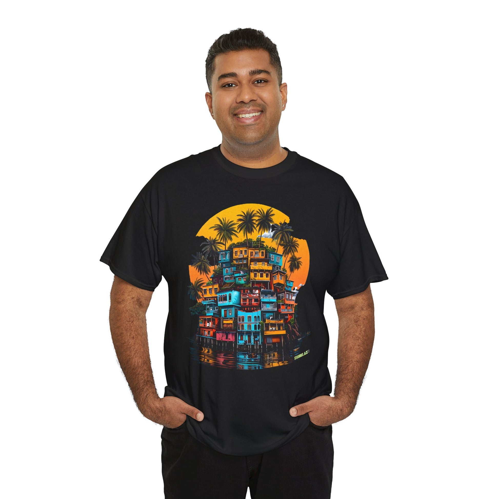 Favella Art Heavy Cotton Tshirt Stacked Buildings Palm Trees Giant Sun 001