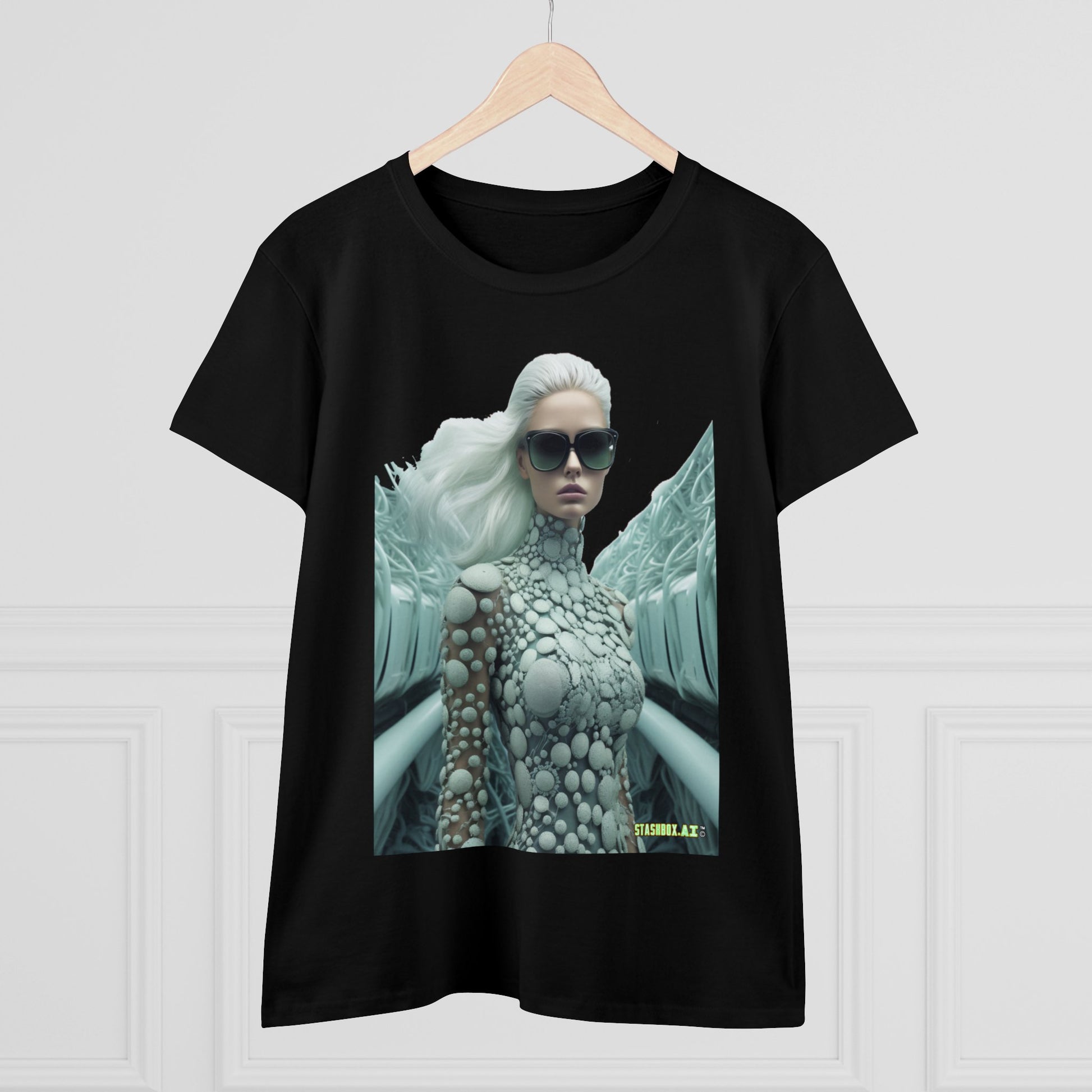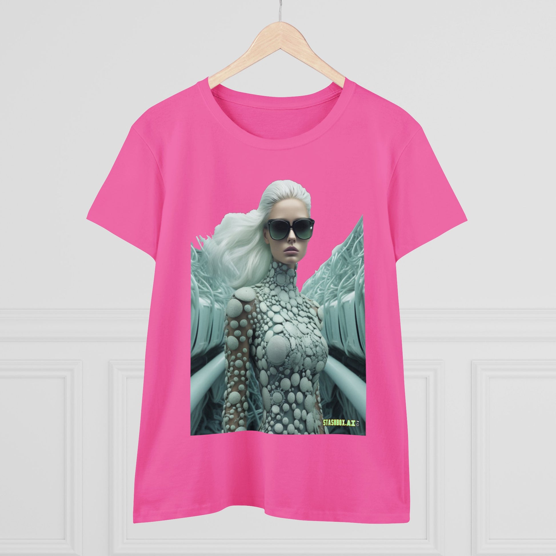 Step into the future with our Silver Futuristic Train Model Women's Midweight Cotton Tee, a perfect fusion of futuristic fashion and iconic train design. Crafted with precision and creativity, this tee showcases a girl in a futuristic outfit, standing confidently in a tunnel. The design embodies the essence of neo plasticism, featuring a harmonious blend of white and aquamarine. Intricate embellishments and meticulous detailing add depth, while solarization techniques create a mesmerizing visual effect. The result is an iconic masterpiece, where airbrushing techniques elevate the design to new artistic heights.