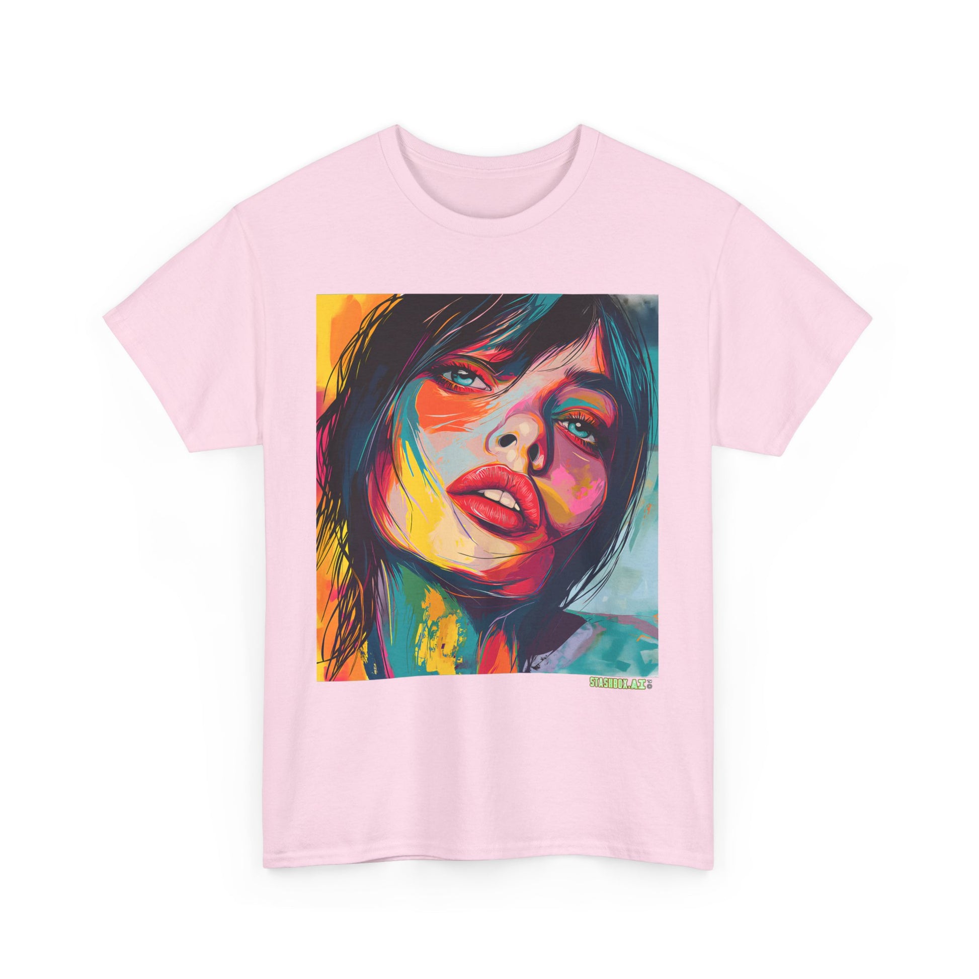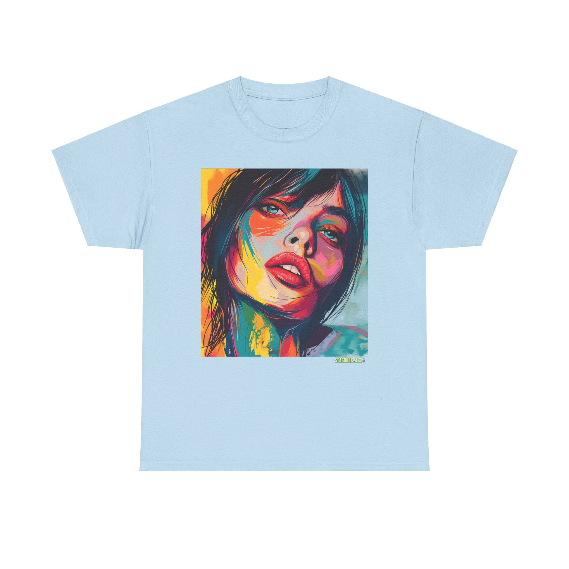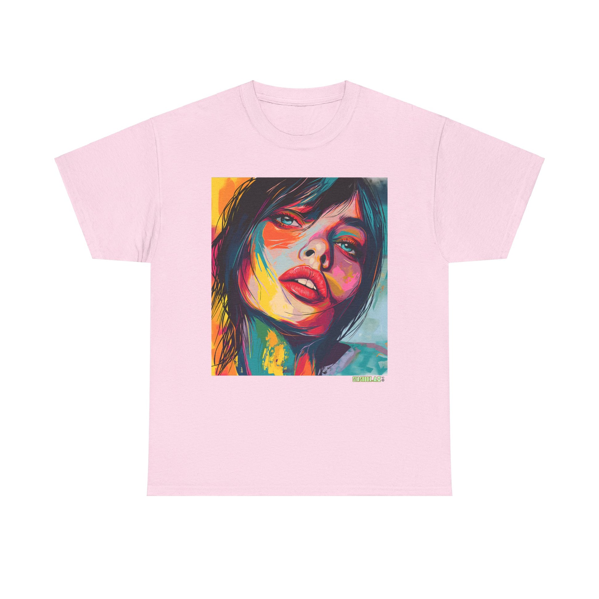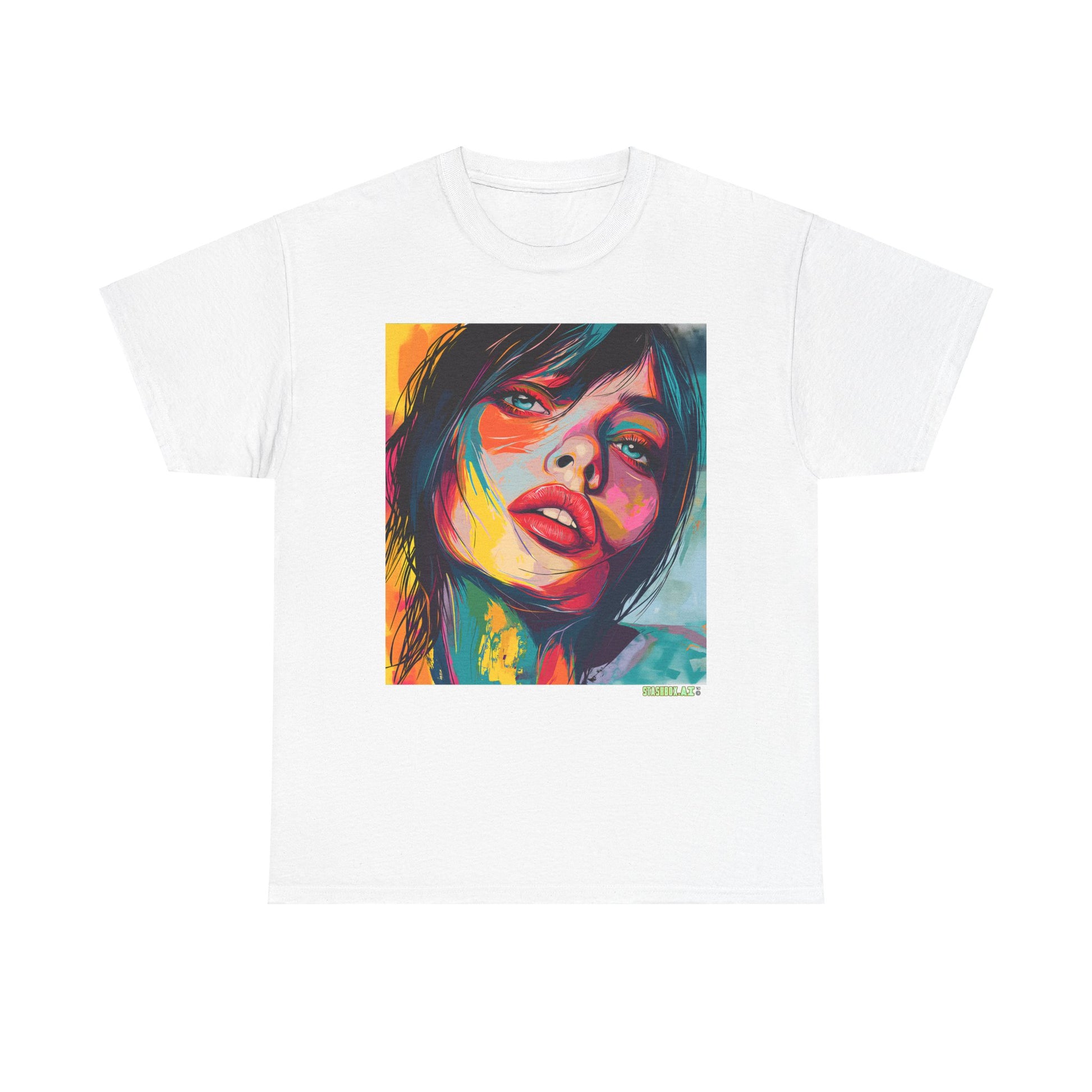 Introducing the Unisex Heavy Cotton T-Shirt Beautiful Woman Drawn in Rainbow Ink 018 – a wearable masterpiece that captures the essence of abstract-realism, vibrant acrylic colors, and hyper-realistic pop art. 🌈👚 Elevate your style with this collection featuring an attractive woman wearing a t-shirt adorned with brightly colored portraits, each designed to be a canvas of artistic expression.
