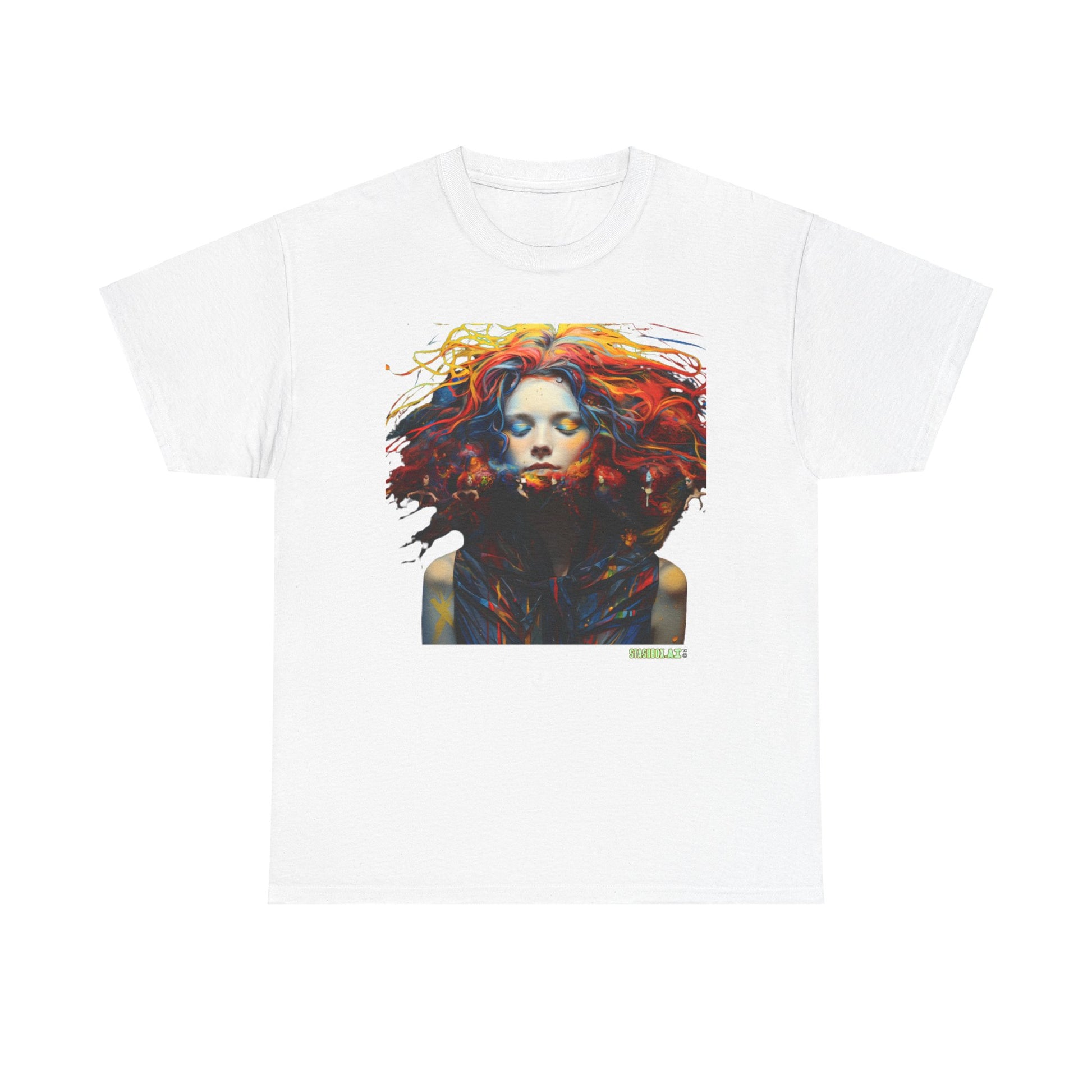 Step into a world of elegance with a white t-shirt showcasing a woman's face with colorful hair. Crafted in the style of 32K UHD, full-body composition, Maranao art influences, and composed, wavy elements, this shirt is a portrait of wearable art. The UHD image captures every detail, turning your everyday look into a masterpiece of contemporary design.
