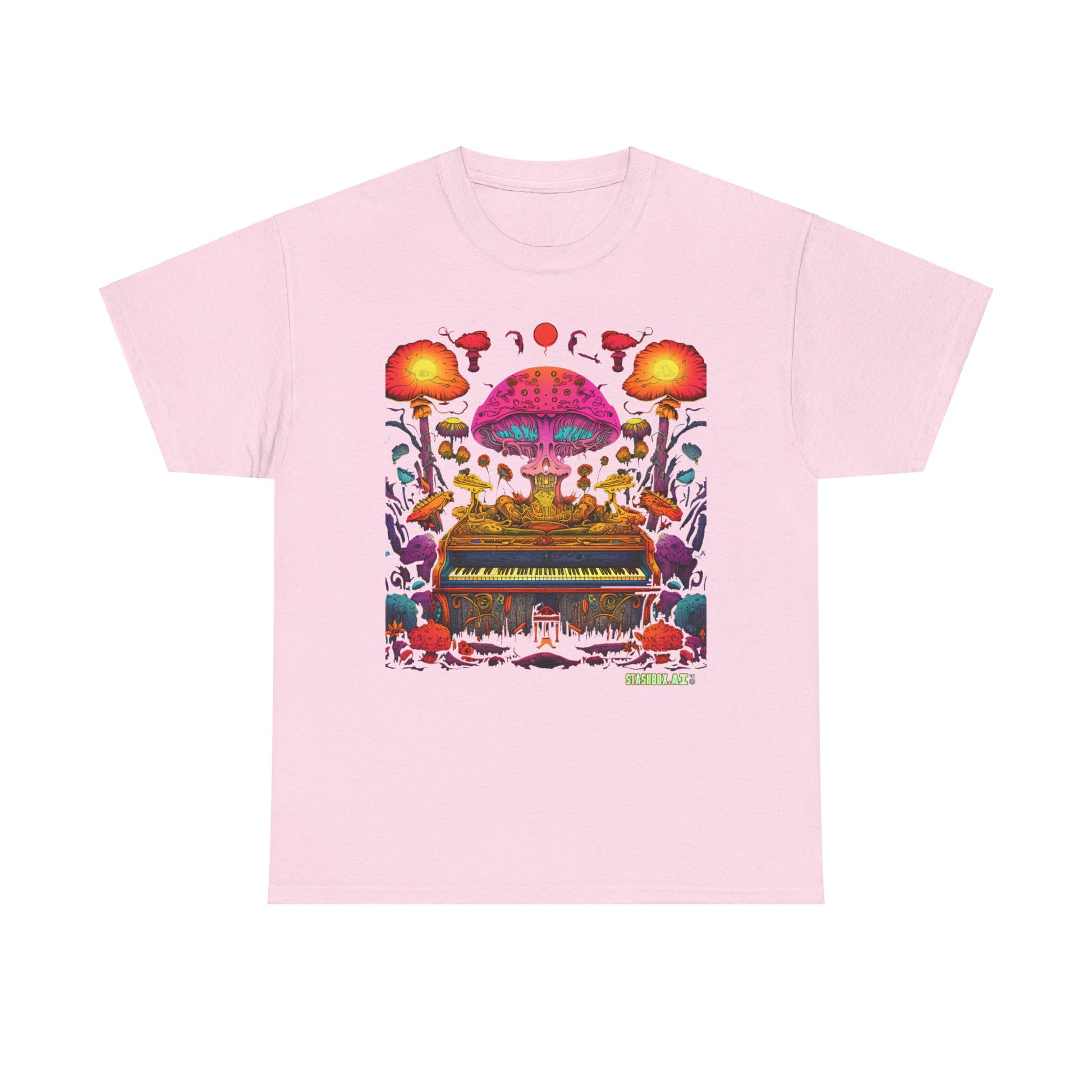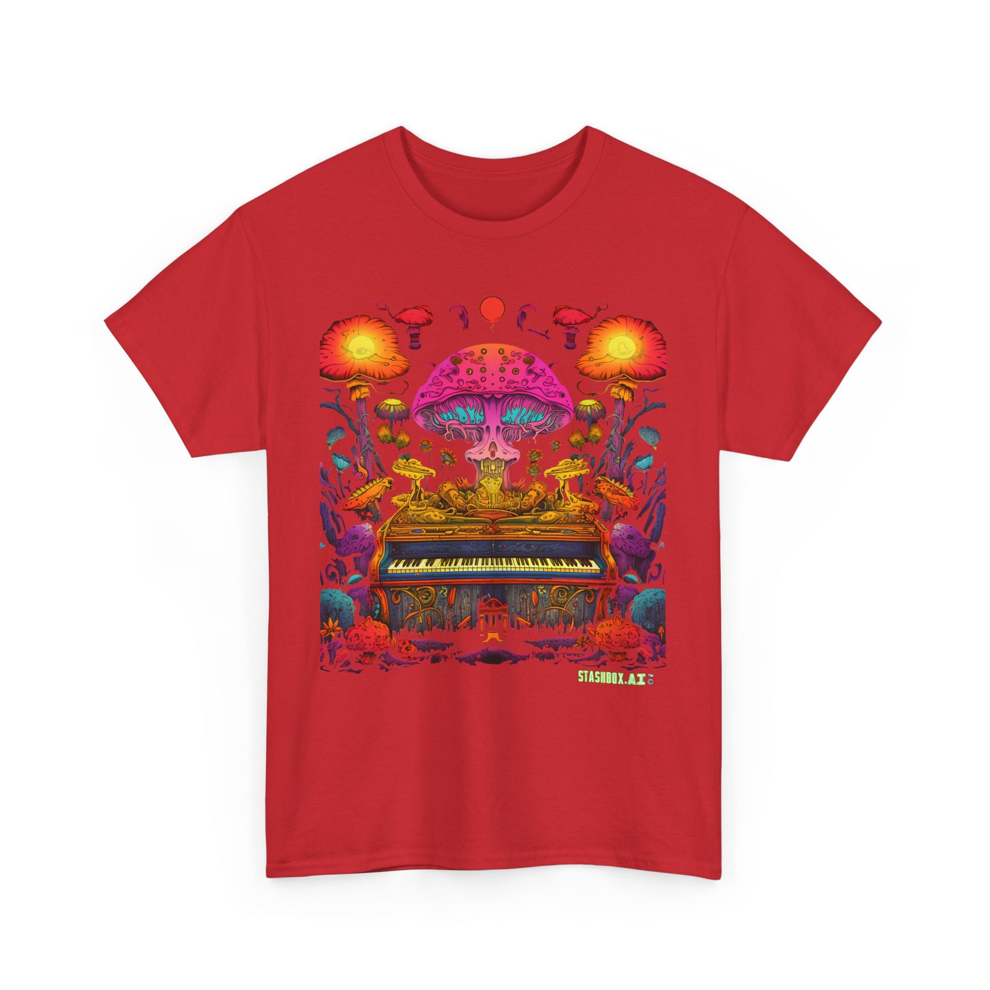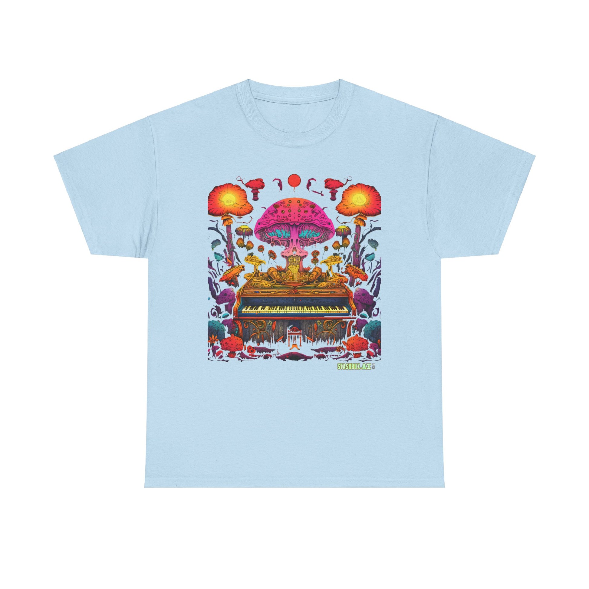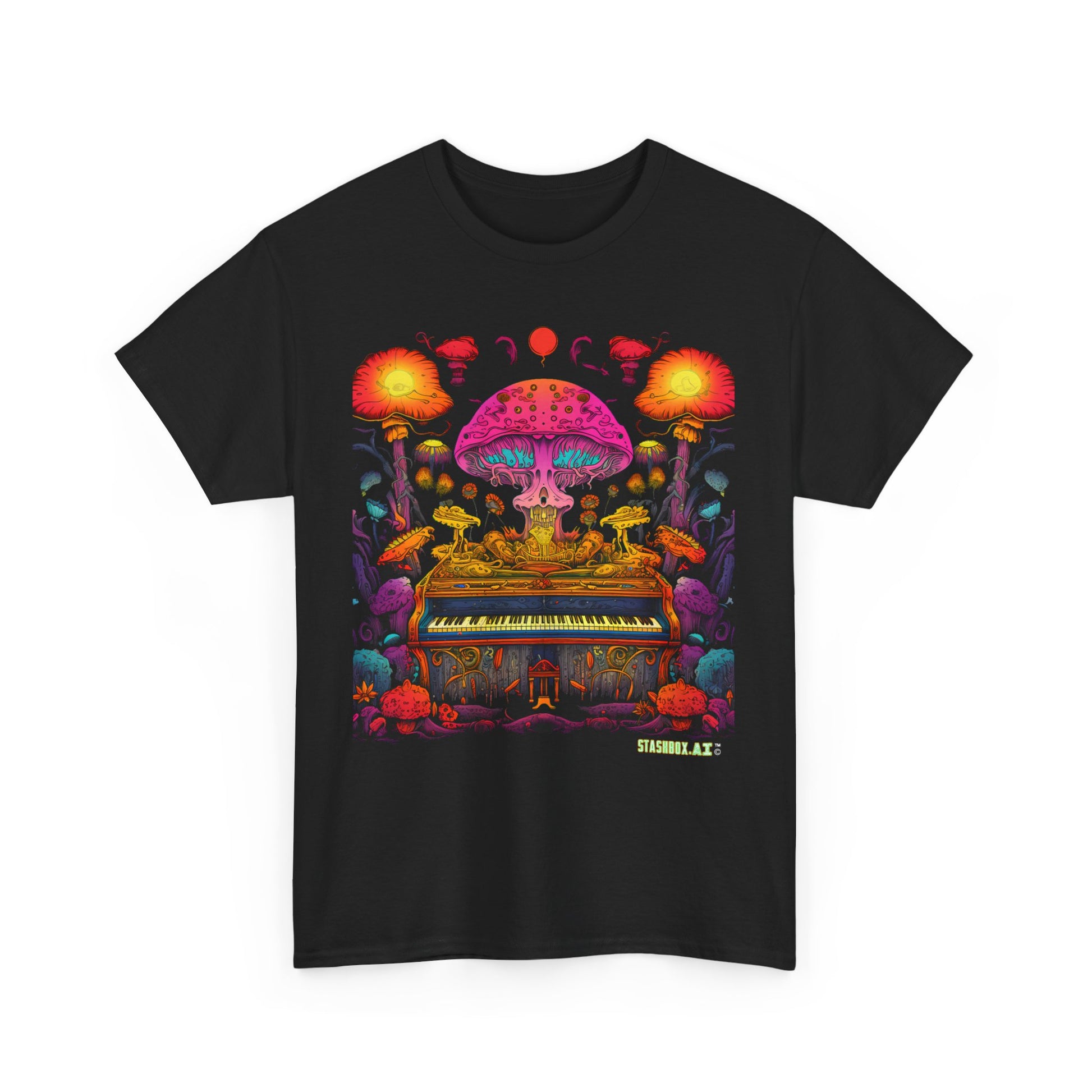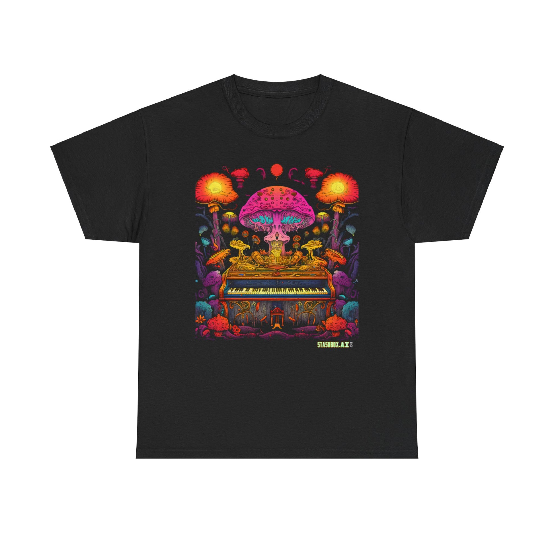 Our Psychedelic Mushrooms and Piano T-shirt is a visual treat, blending layered imagery with subtle irony. The neon lighting, mix of realistic and fantastical elements, and detailed illustrations create a unique piece of wearable art. Embrace the synthetism and vibrant stage backdrops with this extraordinary design.