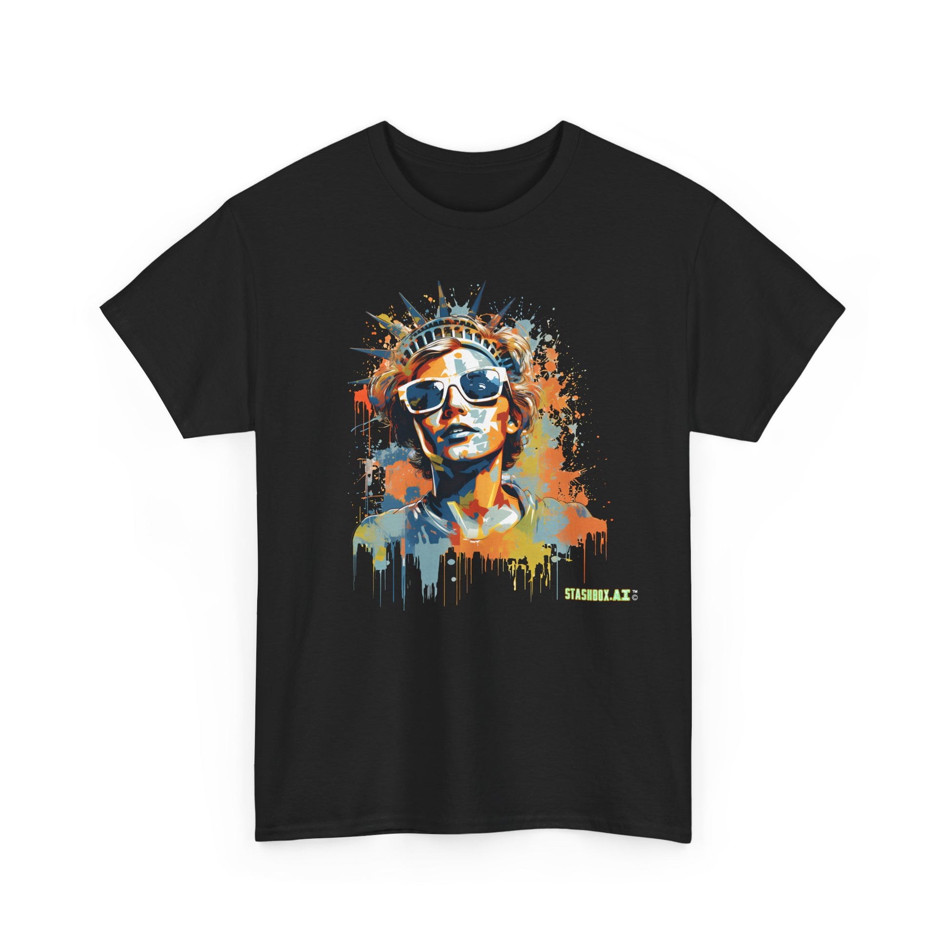 In front of her stands the iconic Statue of Liberty, symbolizing freedom and hope. The scene is brought to life with vibrant paint splashes, adding a dynamic and artistic flair. The design boasts vivid colors and high-contrast lighting, ensuring it stands out with ultra-detailed precision.