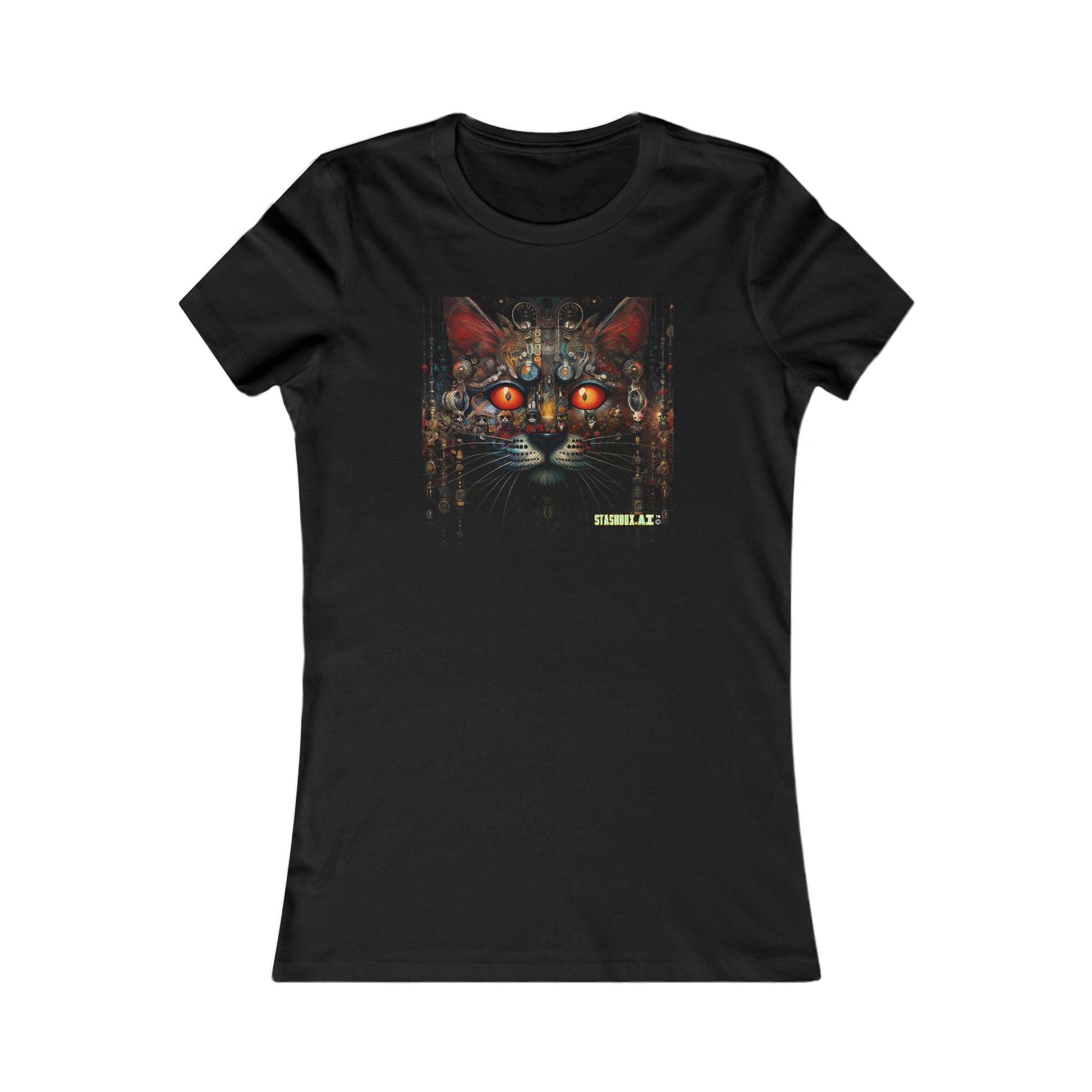 This black women's tee showcases a meticulously crafted cat illustration, where every gear, bolt, and whisker is intricately detailed. The fusion of mechanical precision and feline grace creates a unique and eye-catching design that's sure to turn heads.