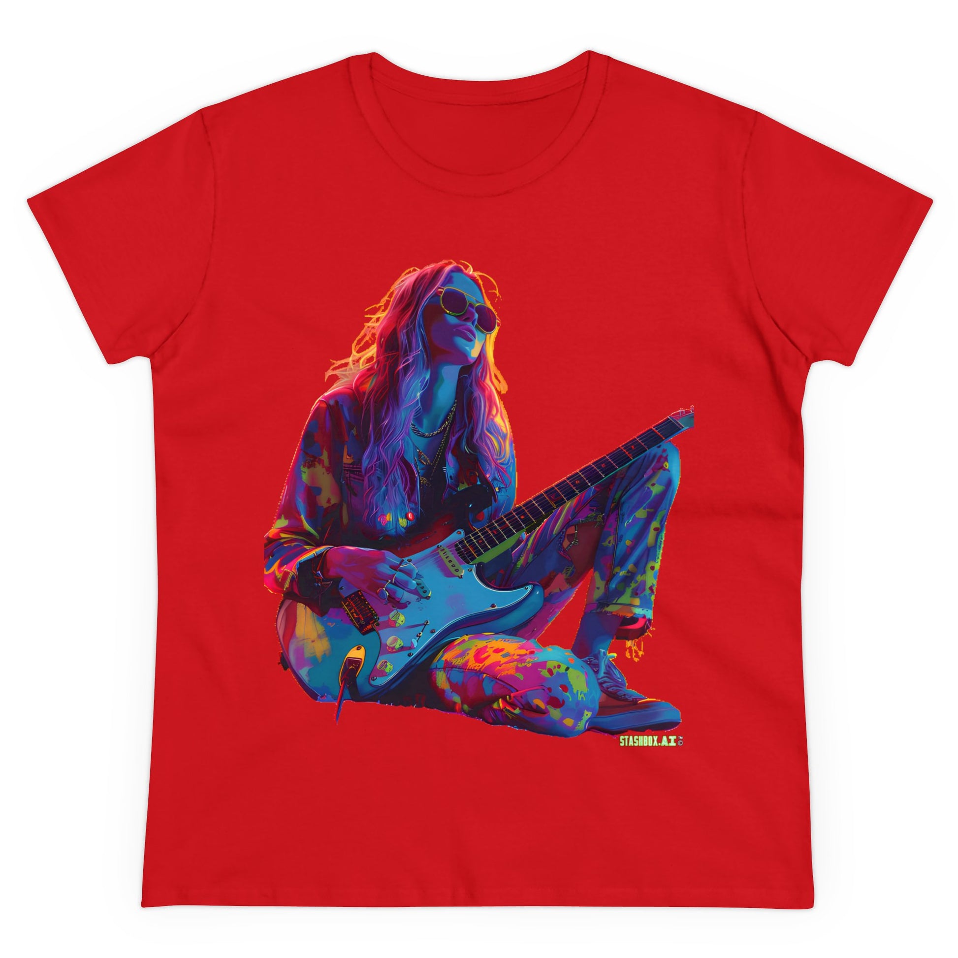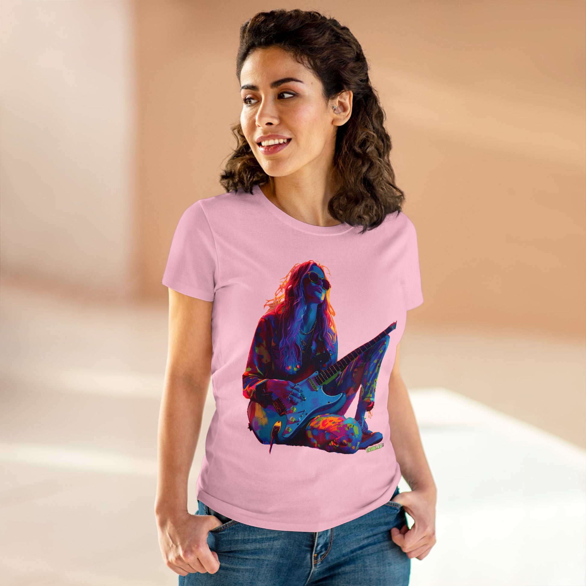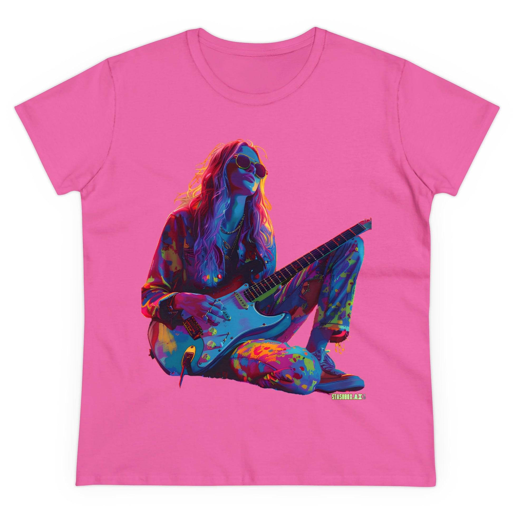 Women's Midweight Cotton Tshirt Colorful Hippy Female Guitarist in the Groove 002