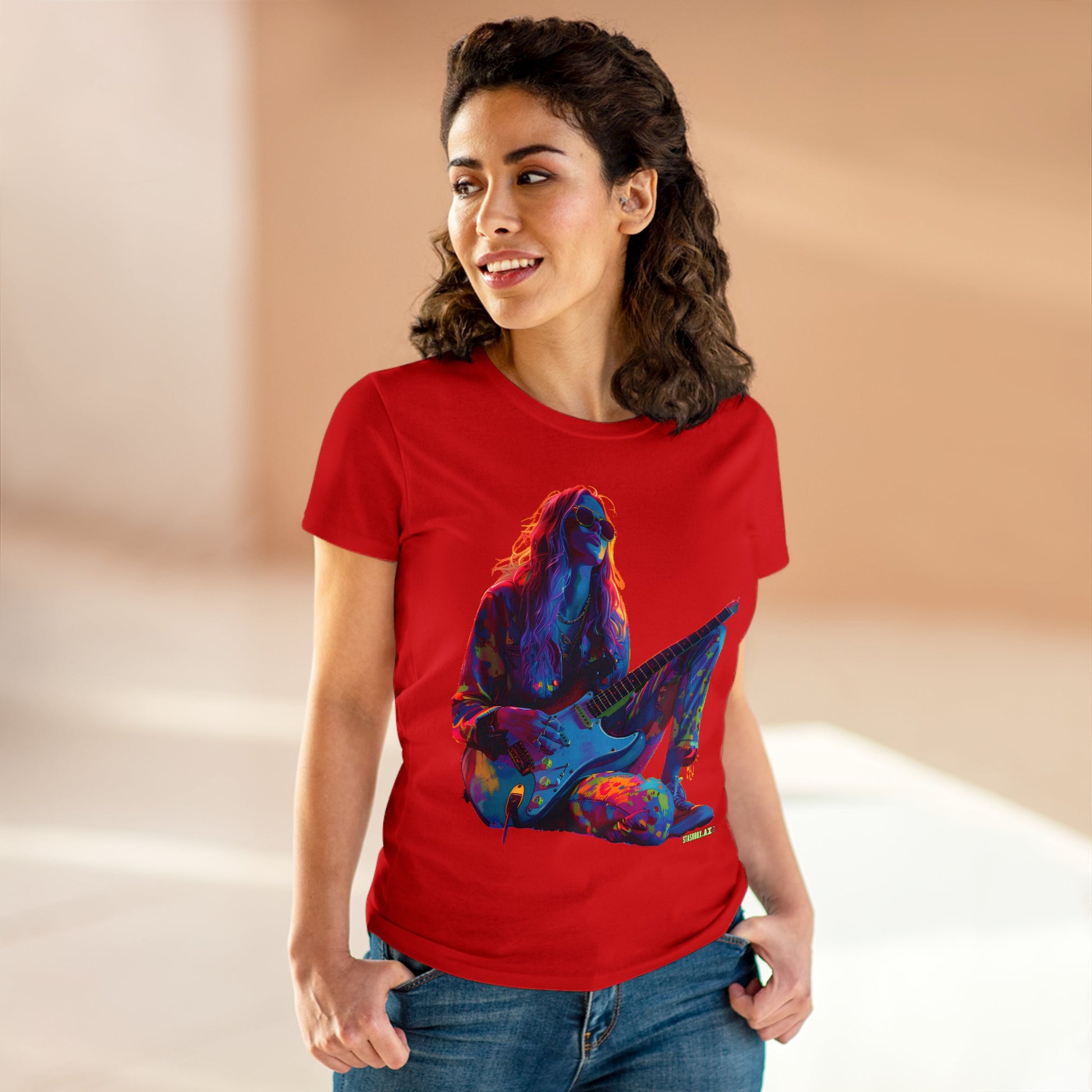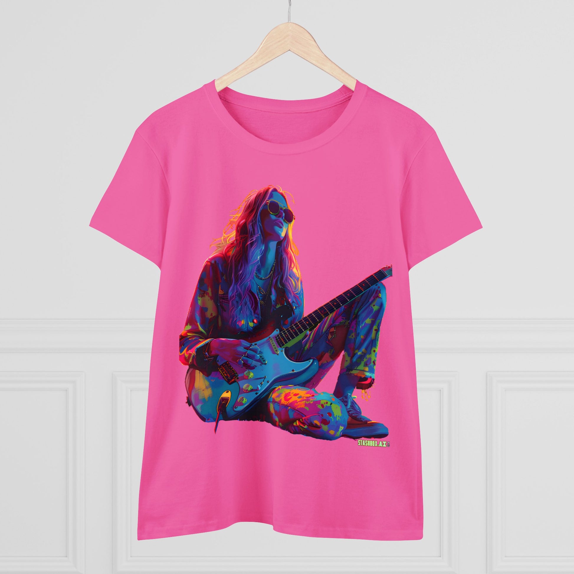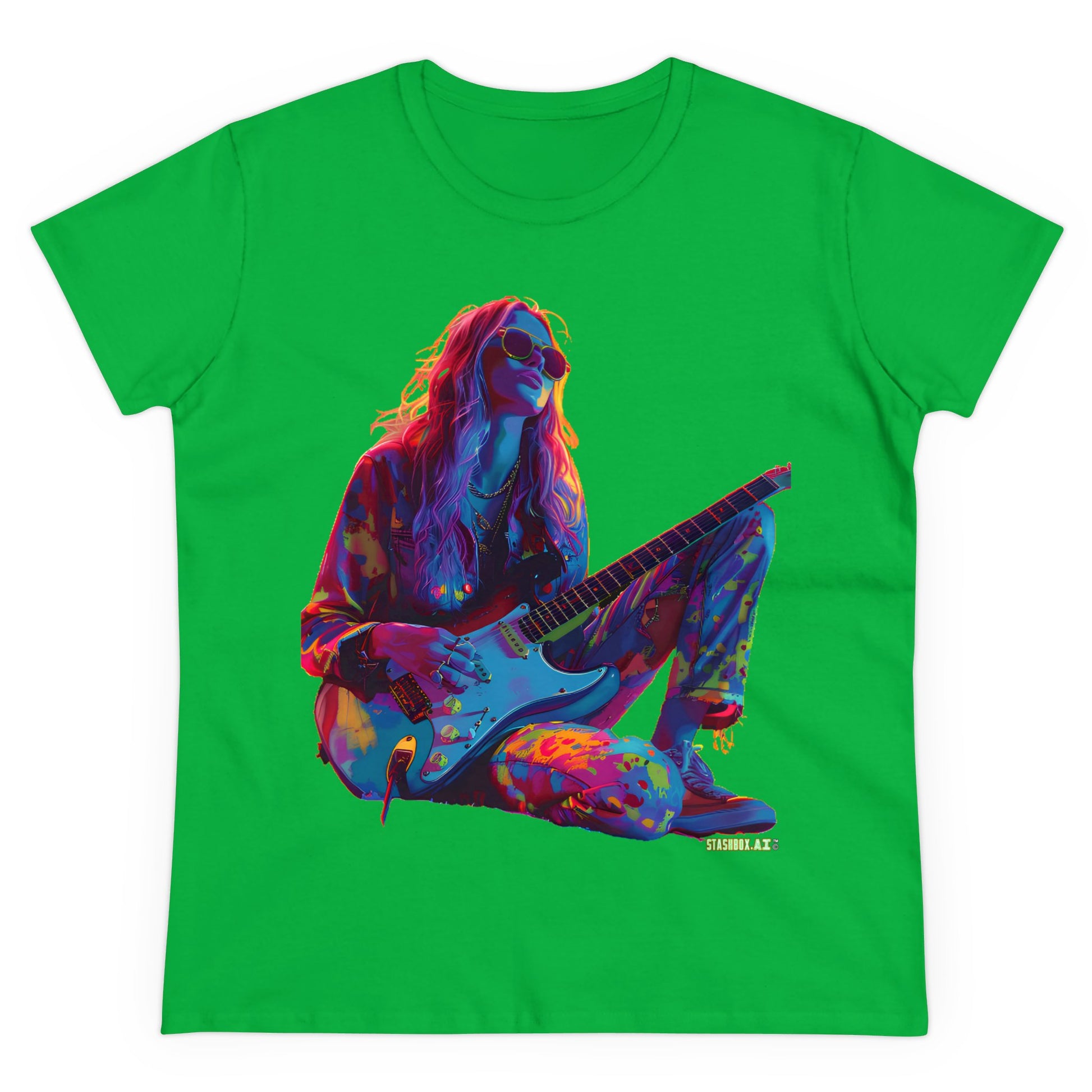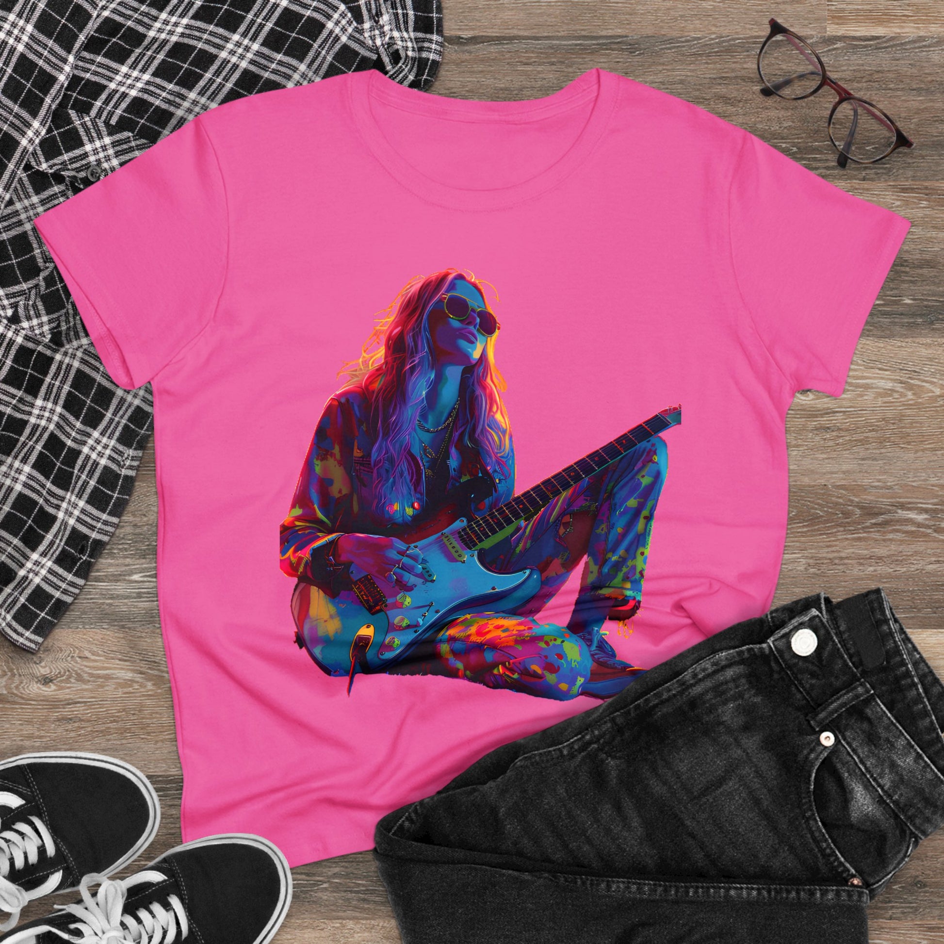 Women's Midweight Cotton Tshirt Colorful Hippy Female Guitarist in the Groove 002