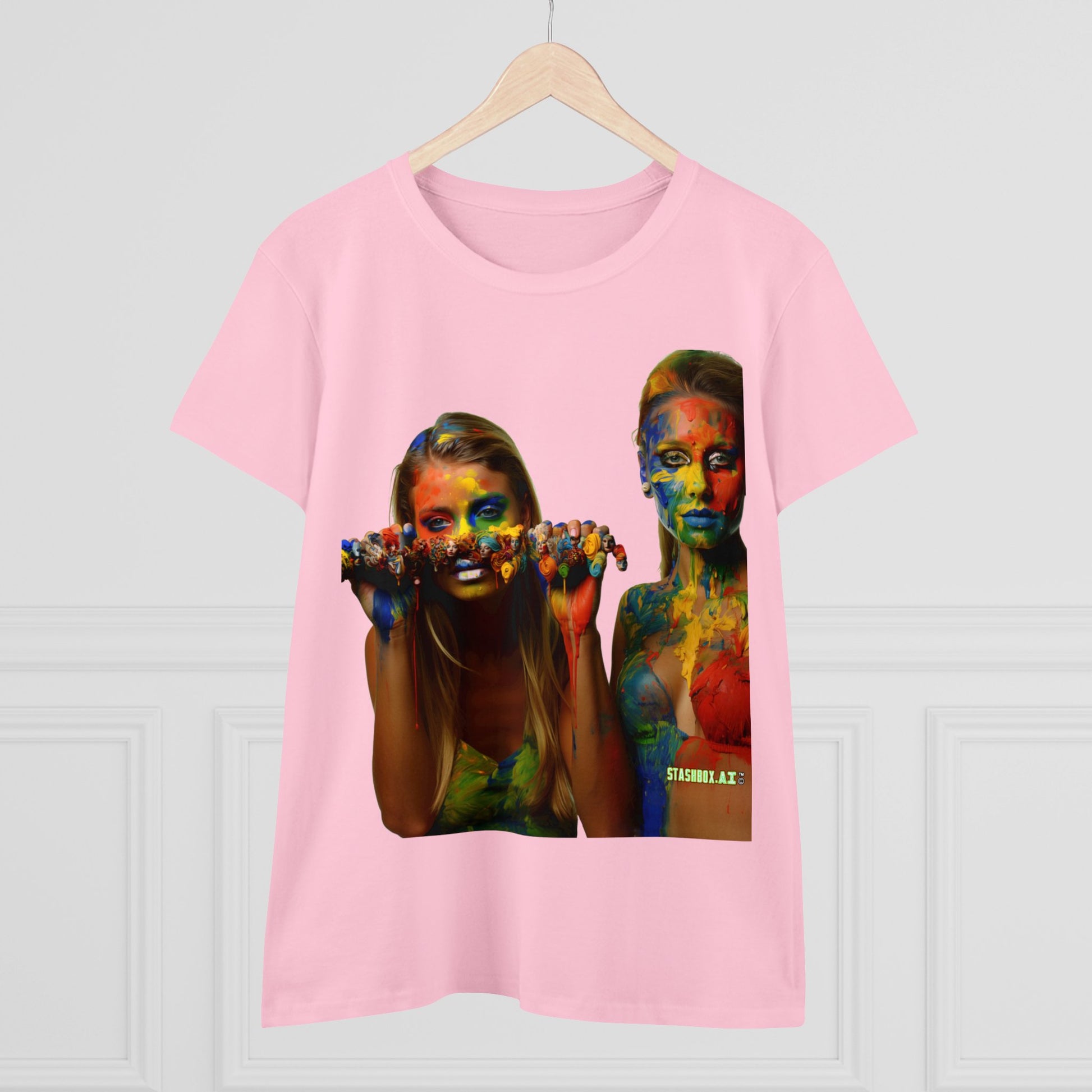 Women's Midweight Cotton Tshirt Two Beautiful Models Covered in Rainbow Paint 023