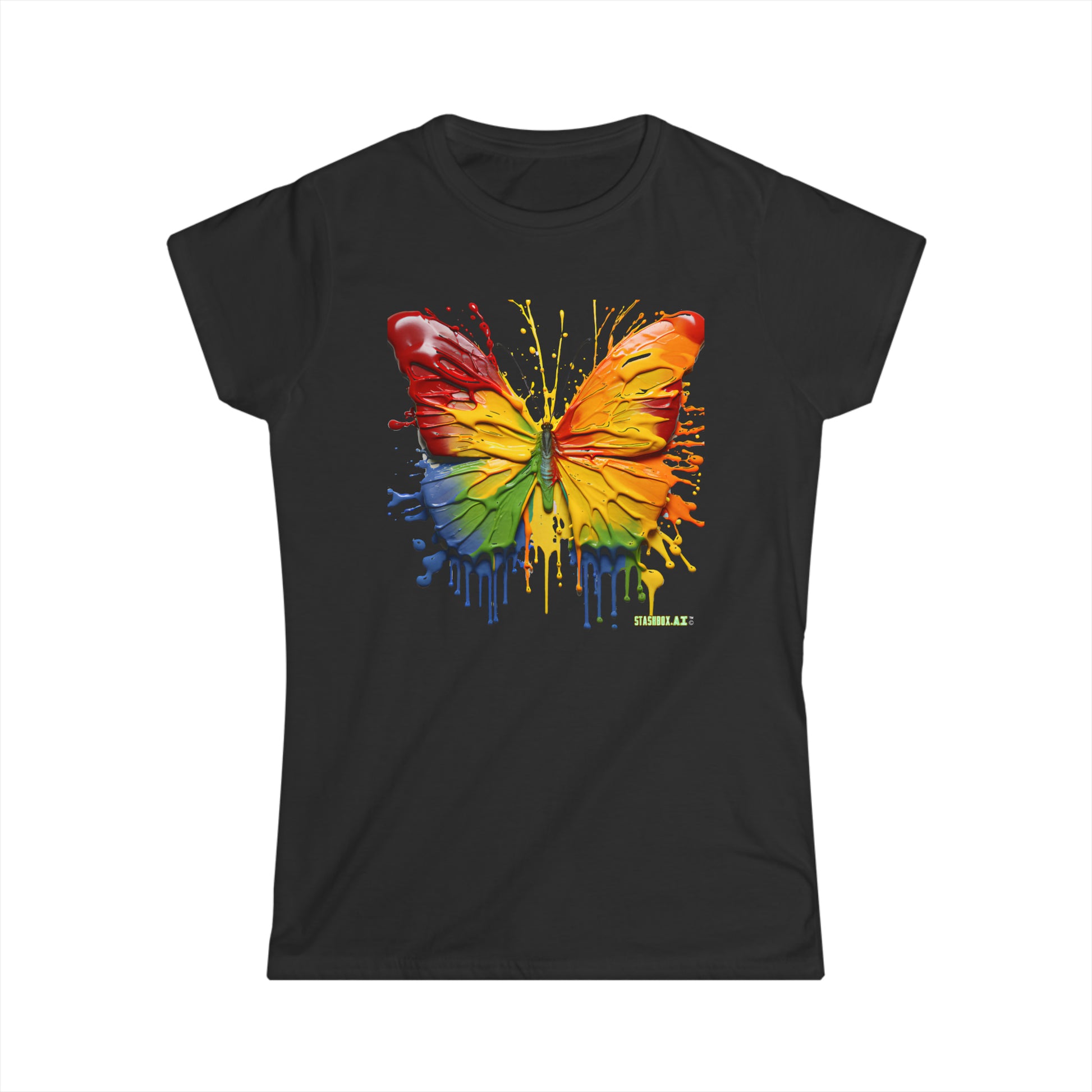 🦋 Express Your Radiance: Introducing our Women's Softstyle Tee - Colorful Butterfly 003, a canvas of vibrant beauty. Embrace the allure of nature with a graceful butterfly adorned in paint-dripping splendor. This stunning design, available in Black, Purple, White, and Light Blue, captures the essence of joy in every flutter.